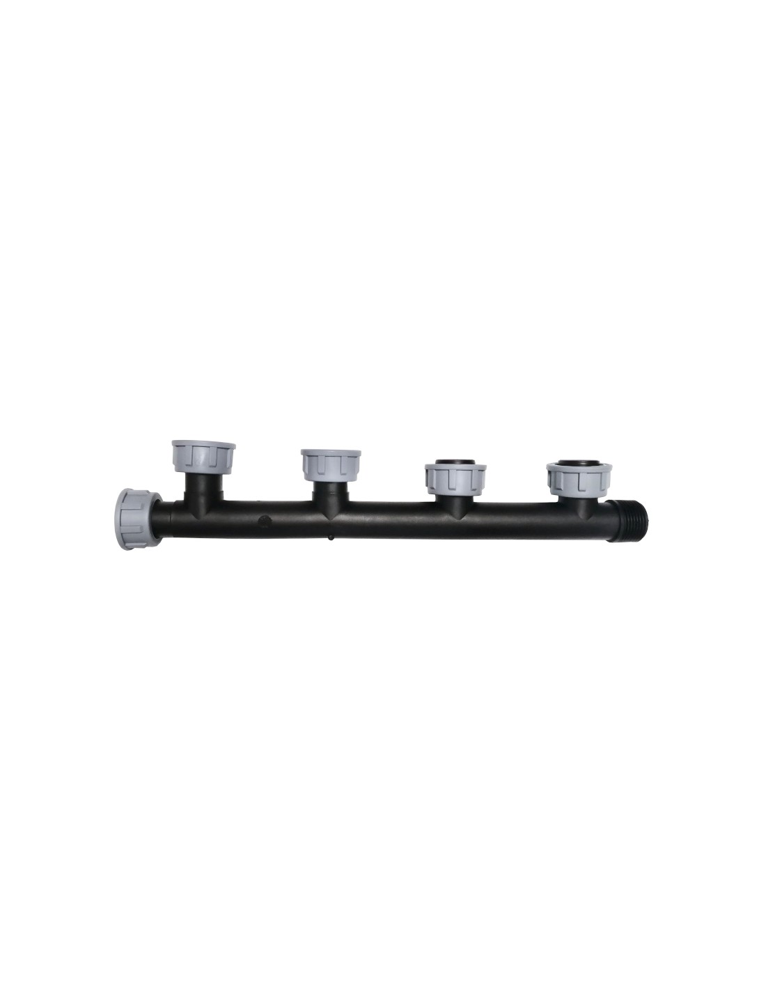 Kolektor PCV - rozdzielacz wody na cztery zawory (4 sekcje / nawet 5). - M1" gwint zewnętrzny x 4 wyjścia F1" gwint wewnętrzny (obrotowe) x F1" gwint wewnętrzny (obrotowe). Najczęściej instalowany w skrzynkach zaworowych. Montuje się na nim elektrozawory lub zawory ręczne kulowe. Aby zainstalować zawory z gwintami wewnętrznymi należy pomiędzy elektrozaworem a kolektorem nakręcić nypel M1" x M1".