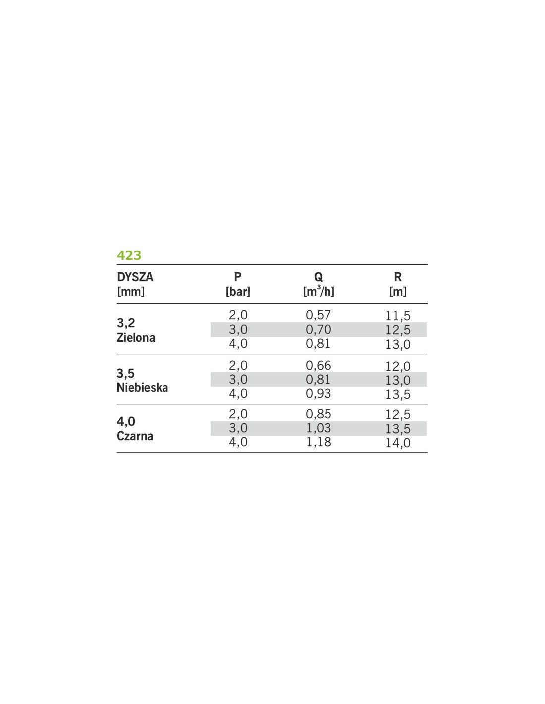 Tabela doboru dysz do zraszacza młoteczkowego 423 firmy NaanDanJain